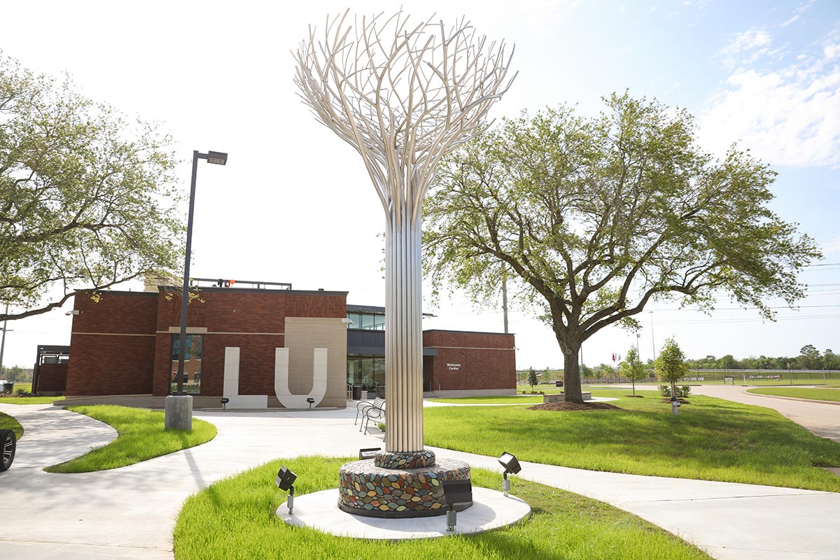 Carter Ernst and Paul Kittelson designed and created Cardinal Column specifically for Lamar University. The artists toured campus in May 2019 to get a feel for the campus and the site for the sculpture. They wanted to create a work of art that would be interactive and recognizable as visitors approach campus from Rolfe Christopher. The bird nest concept was an ideal choice with its reference to Lamar’s cardinal mascot. The artists created a similar bird nest sculpture for Hobby Airport in Houston.